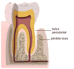 En este caso no sólo se afecta la encía si no también el resto de tejidos que sujetan el diente, como son el ligamento periodontal y el hueso alveolar; ésta es la principal característica diferencial con la gingivitis. Además se produce normalmente una separación entre la encía y el diente, que se denomina bolsa periodontal. Suele tener una profundidad de 4 o más milímetros.